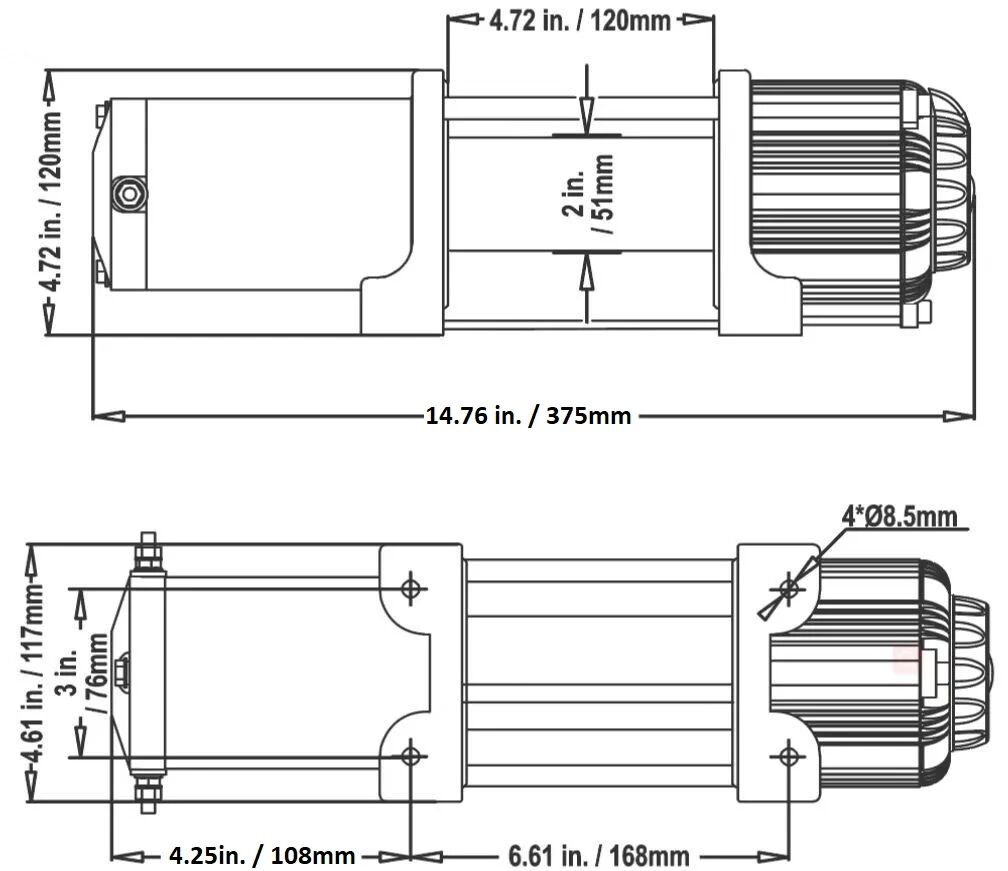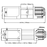 Winch Dimensions: 14.9” x 4.7” x 4.5” (379mm x 120mm x 115mm)