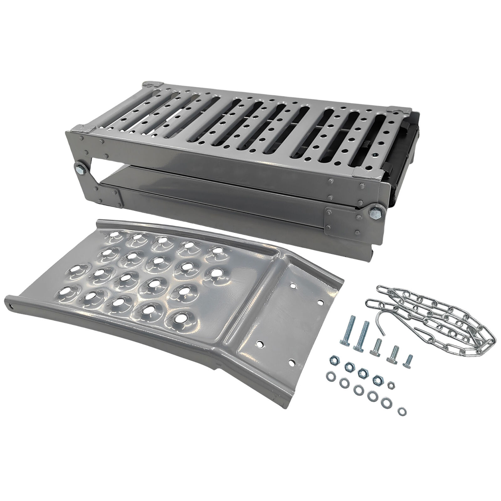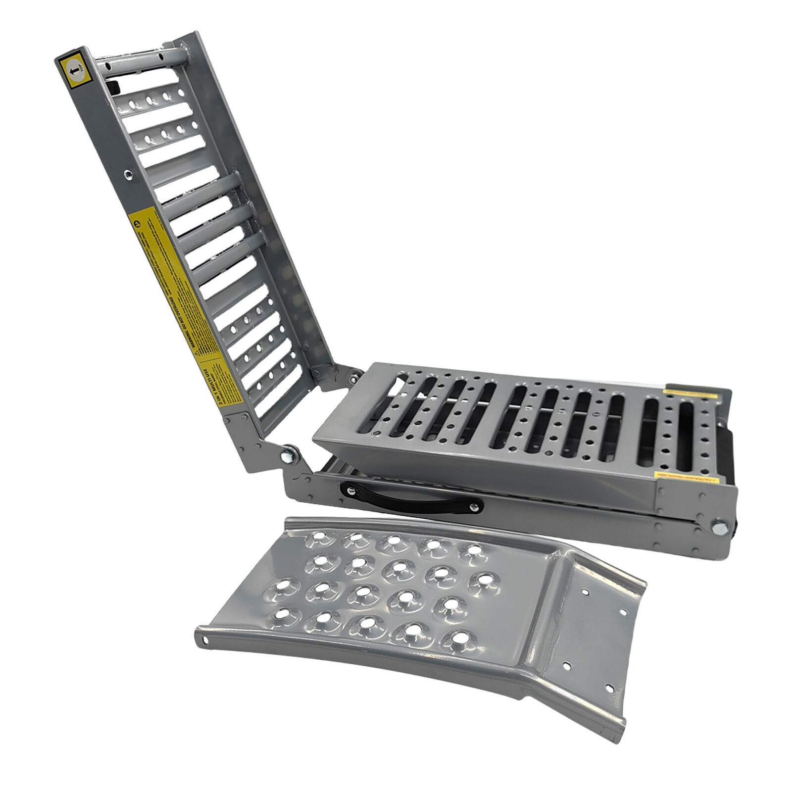 2-In-1 Multi-Use Steel Foldable Ramp Set Helps Safely Load And Unload Equipment Into Your Vehicle. Dual Purpose Ramp For Loading Or Elevation.